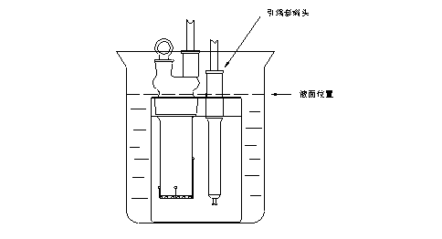 (3).如仍不能拆卸,請將滴定池放入2升的燒杯中,慢慢加入濃度為5%的氯化鉀溶液侵泡,其液面位置見圖十四,必須十分注意,不要讓測量電極﹑陰極室電極的引線套端頭進入液體,侵泡約十幾小時或24小時后,即可拆卸(此方法可重復(fù)進行)。